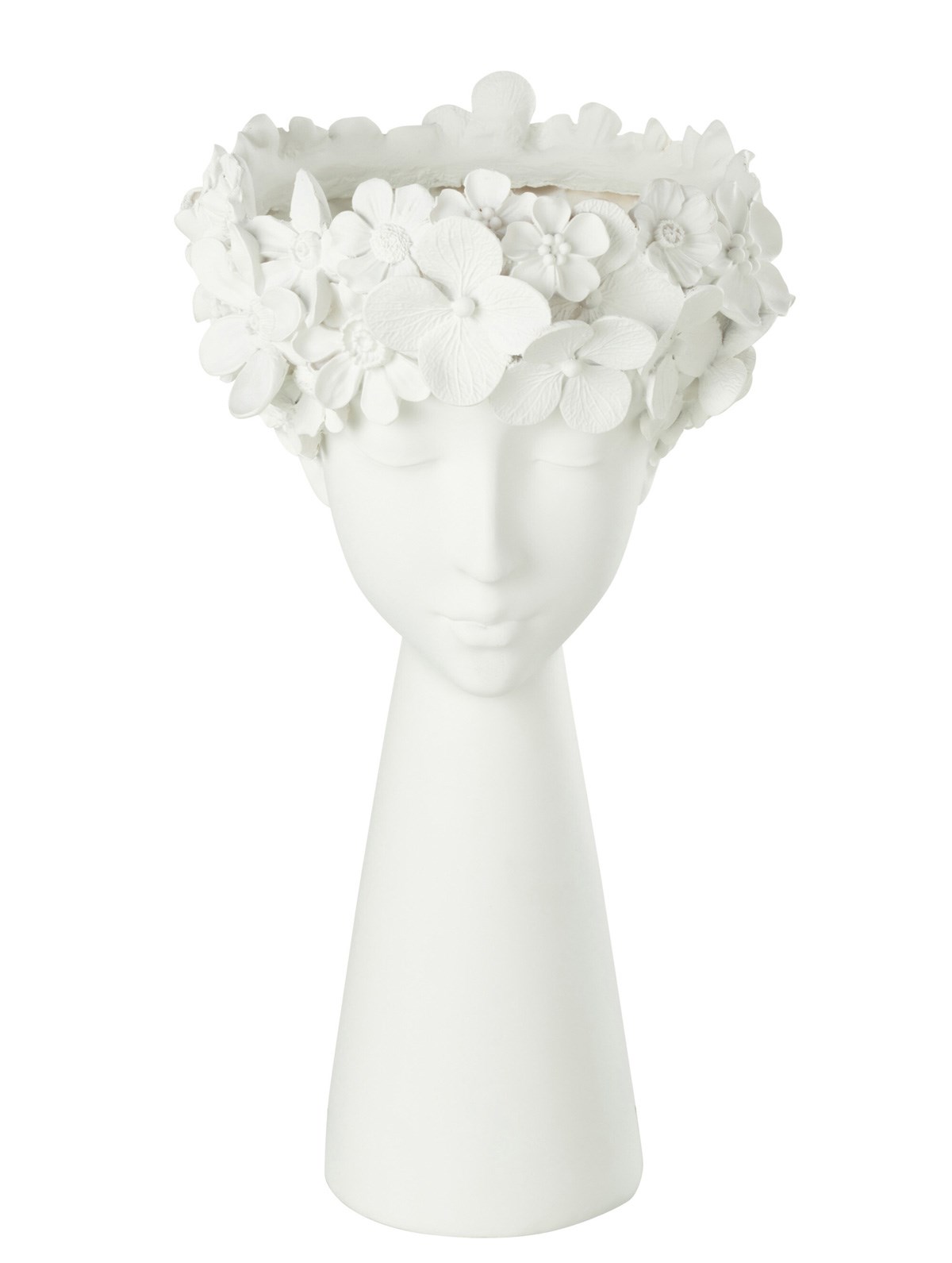 Voeg een vleugje originaliteit toe aan uw interieur met deze bloempot in de vorm van een hoofd, gemaakt van stevig kunsthars. De matwitte kleur en sculpturale lijnen maken het tot een modern en gedurfd decoratiestuk. Met zijn afmetingen van 23 x 23 x 40 cm is hij geschikt voor groene planten of gedroogde bloemen en trekt hij meteen de aandacht. Deze plantenpot is ideaal om een plank, buffetkast of console te verfraaien en geeft elk interieur een artistieke en eigentijdse toets. Aanbevolen voor gebruik binnenshuis. Plant niet inbegrepen.