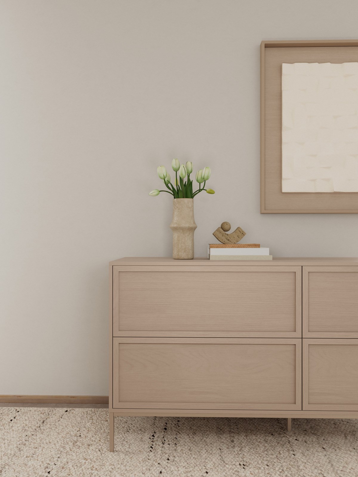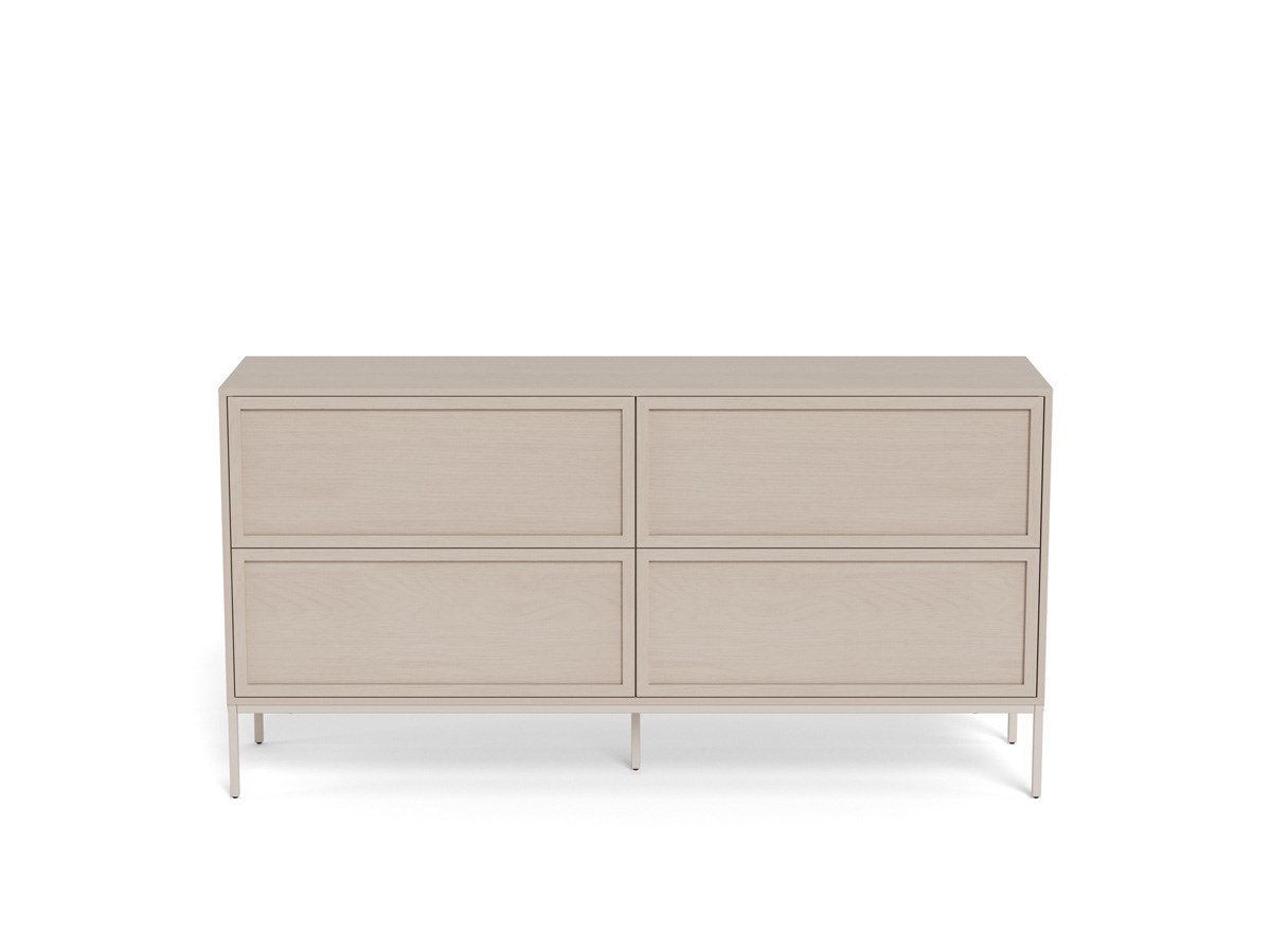 De lades met druk-open systeem, afgewerkt met elegante latten, bieden praktische opbergruimte en sluiten mooi aan bij het slanke frame met een stijlvolle voorkant. Het onderstel in antracietgrijs staal met poedercoating garandeert stabiliteit en een lichte uitstraling, terwijl het de moderne stijl van de kast benadrukt.