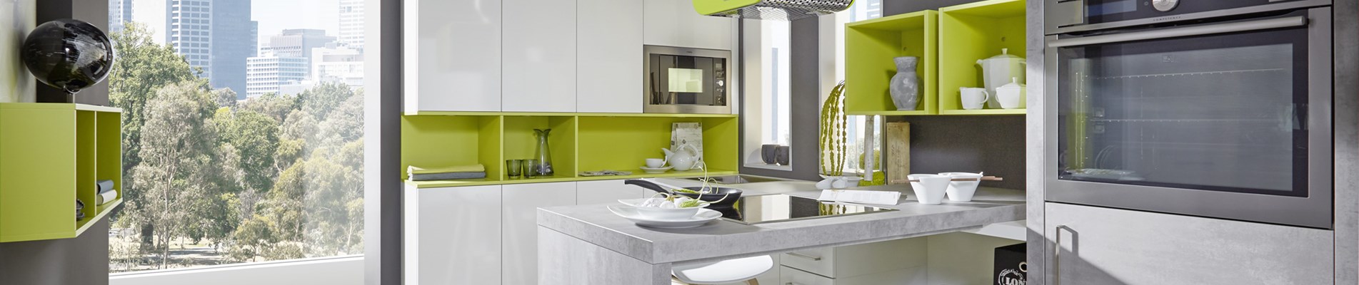 Stijlvolle keuken die erg fris oogt dankzij de kleurrijke toets in de kasten. De combinatie van de kleuren witglanzend en betongrijs geeft het geheel een industrieel karakter.