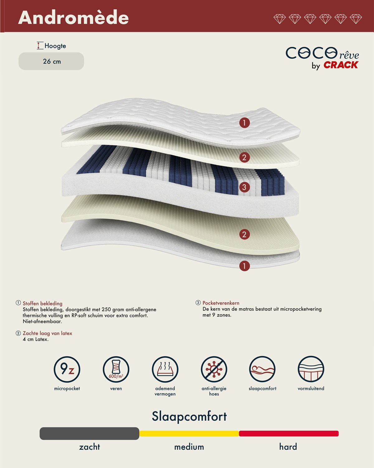 De ANDROMÈDE matras van 200x200 cm biedt een zacht slaapcomfort, ideaal voor wie houdt van een omhullend gevoel met toch een goede ondersteuning. Met zijn royale hoogte van 26 cm combineert hij een ademende stoffen hoes, een lichte latexlaag voor aangename soepelheid en een kern van pocketveren die zorgt voor gerichte ondersteuning en optimale bewegingsvrijheid.