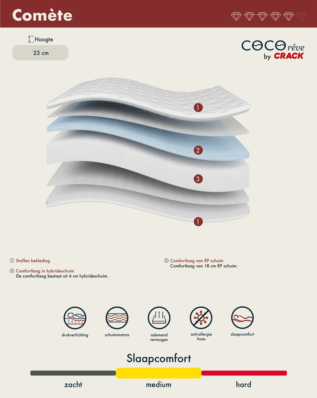 Ervaar een perfect uitgebalanceerd slaapcomfort met de COMÈTE matras, ontworpen voor een aangename ondersteuning en een medium stevigheid. Met een hoogte van 23 cm combineert hij een ademende stoffen hoes, een laag hybride comfortschuim voor goede ondersteuning en een RP-comfortschuimlaag die zorgt voor extra stabiliteit en comfort. Deze harmonieuze samenstelling biedt een gelijkmatige ondersteuning van het lichaam en een aangenaam gevoel gedurende de hele nacht.