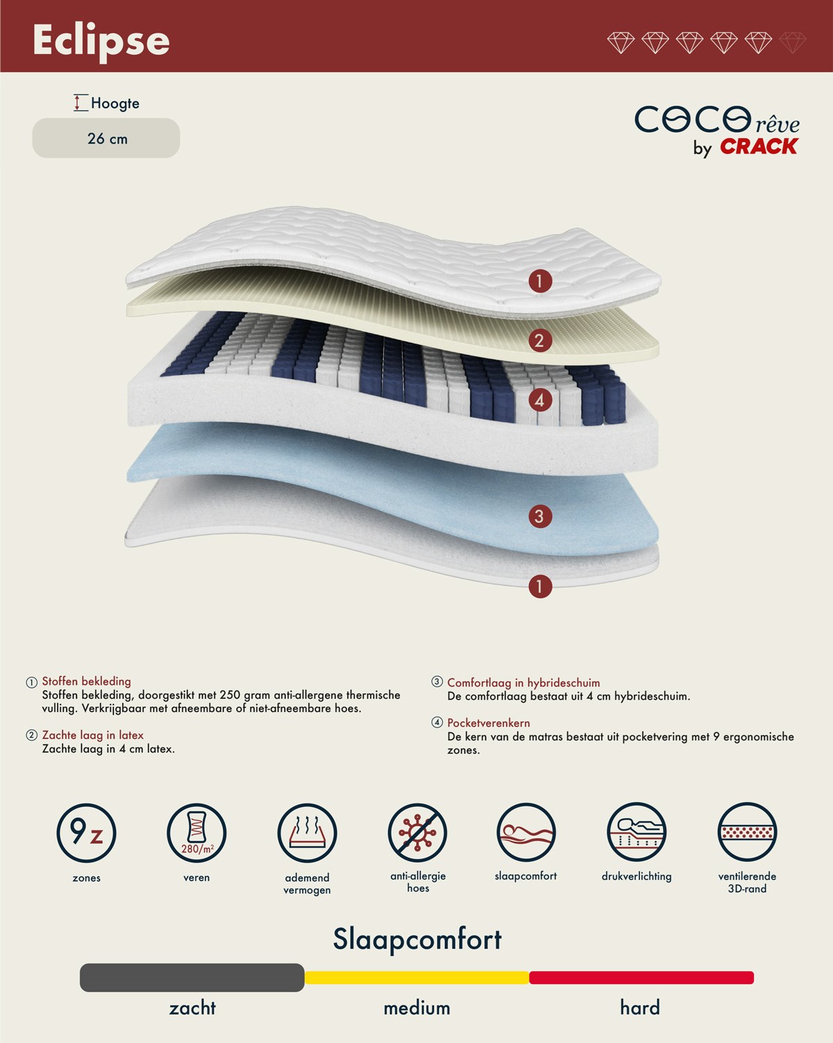 Geniet van een rustgevende nachtrust met de ECLIPSE matras, met een comfortabele hoogte van 26 cm en een zachte liggenvelop. De hoogwaardige opbouw bestaat uit een ademende stoffen hoes, een laag licht latex voor natuurlijke elasticiteit, een hybride comfortschuimlaag voor evenwichtige ondersteuning en een kern met pocketveren die uitstekende bewegingsonafhankelijkheid biedt. Deze combinatie van materialen zorgt voor een aangenaam omhullend gevoel, ideaal voor rustige en herstellende nachten.