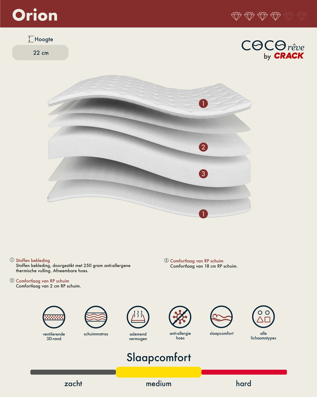 Ervaar een harmonieuze nachtrust met de ORION matras, met een hoogte van 22 cm en een medium stevigheid voor uitgebalanceerde ondersteuning. De matras bestaat uit een ademende stoffen hoes, een comfortlaag van HP-schuim die zorgt voor stabiele ondersteuning, en een RP-schuimlaag die extra comfort en een betere drukverdeling biedt. Samen garanderen deze materialen een aangenaam ligoppervlak en een gelijkmatige ondersteuning gedurende de hele nacht.