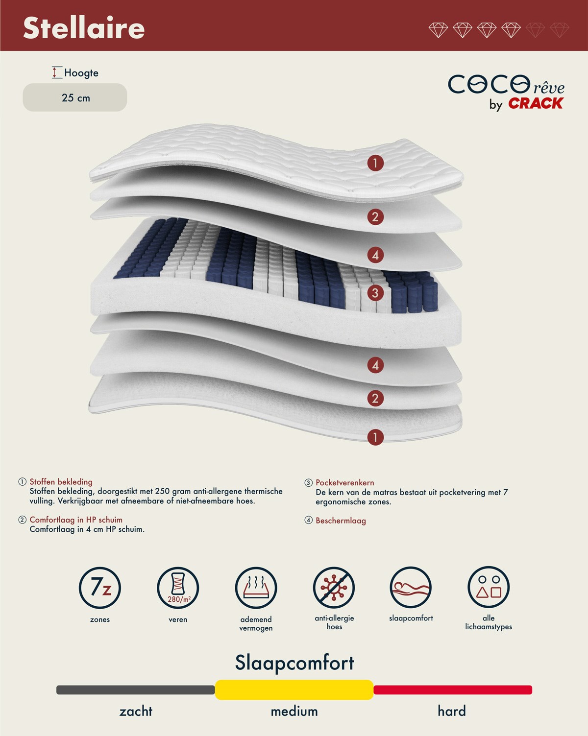 Geniet van een uitgebalanceerde nachtrust met de STELLAIRE matras, met een hoogte van 25 cm en medium comfort dat ideaal is voor harmonieuze ondersteuning. De matras bestaat uit een ademende stoffen hoes, een comfortlaag van HP-schuim voor optimale ondersteuning, een kern met pocketveren die uitstekende bewegingsonafhankelijkheid biedt, en een beschermlaag die de duurzaamheid van de matras verlengt. Deze combinatie van materialen zorgt voor stabiel en gelijkmatig comfort voor herstellende nachten.