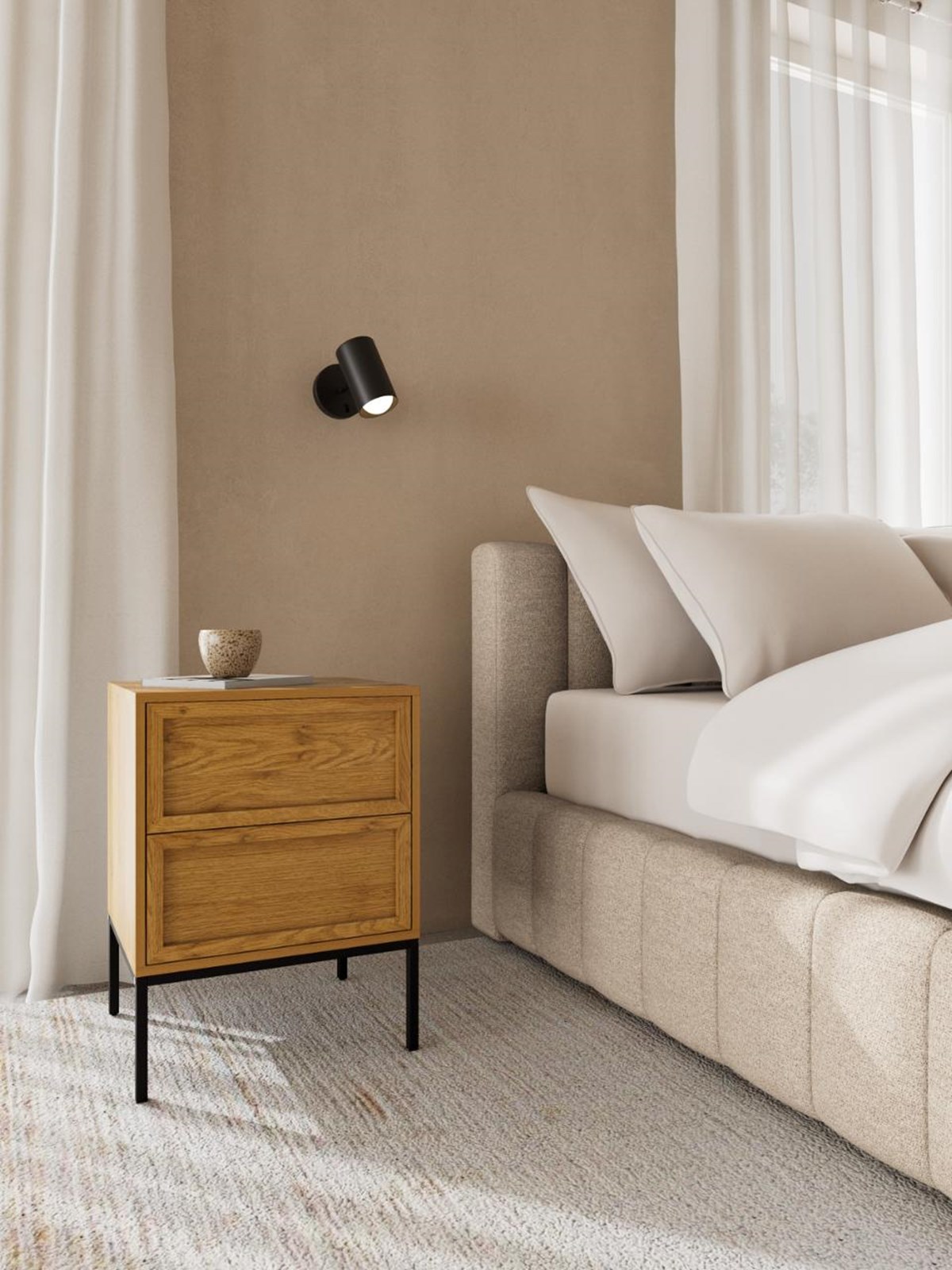 Het rechthoekige nachtkastje PALMADE combineert elegantie en functionaliteit voor moderne slaapkamers. Het blad, de structuur en 2 lades in mat wilde eik melamine bieden een onderhoudsvriendelijk oppervlak en praktische opbergruimte voor uw essentials. De in de structuur geïntegreerde lades openen met één druk, wat gebruiksgemak en moderne eenvoud combineert. Het onderstel in mat zwart gelakt staal zorgt voor stabiliteit en duurzaamheid, terwijl de strakke lijnen een minimalistische en warme stijl benadrukken. Een stijlvolle en praktische aanvulling voor uw slaapkamer.
