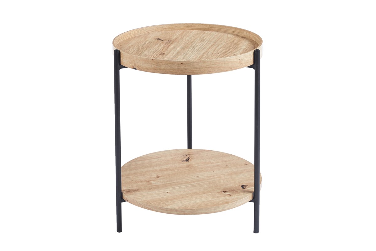 Ontdek de ronde salontafel Dalina in oud eiken, met zijn twee bladen, waarvan één met een rand voor extra gebruiksgemak. De slanke zwarte metalen poten voegen een vleugje verfijning toe. Deze natuurlijke, sobere en praktische salontafel kan gecombineerd worden met de salontafel van 80 cm uit dezelfde collectie. Transformeer je woonkamer met dit onmisbare meubelstuk!