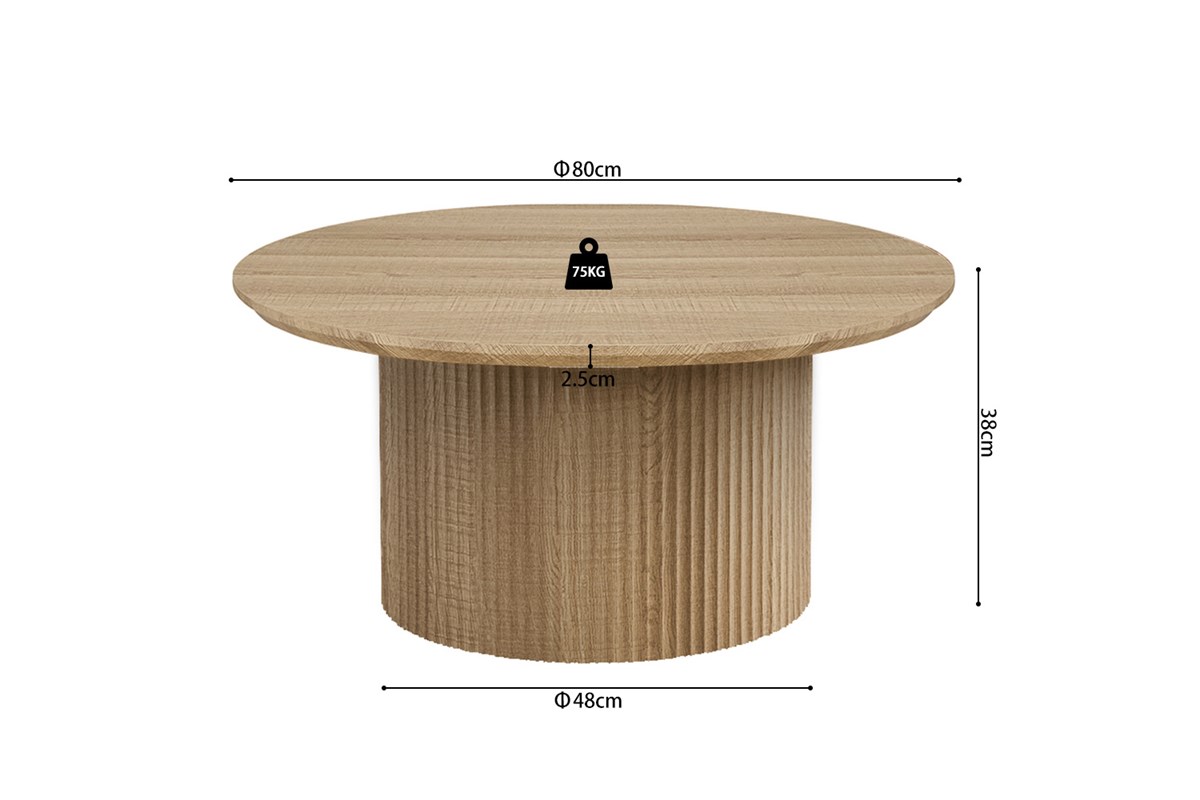 De LAGOS salontafel combineert tijdloze eenvoud met moderne elegantie. Dankzij de ronde vorm, verticale ribbelstructuur en warme houtlook is deze tafel een perfecte toevoeging aan elke woonkamer. Met een diameter van 80 cm en een hoogte van 38 cm is de LAGOS ideaal als salontafel, bijzettafel of decoratief accentstuk.