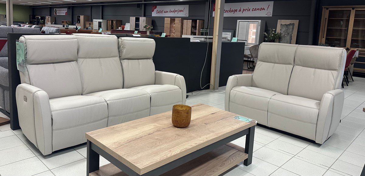 Mooie lederen salon bestaande uit 3zit met 2 electrische relaxen en verstelbare hoofdsteun + 2zit vast in samoa grege