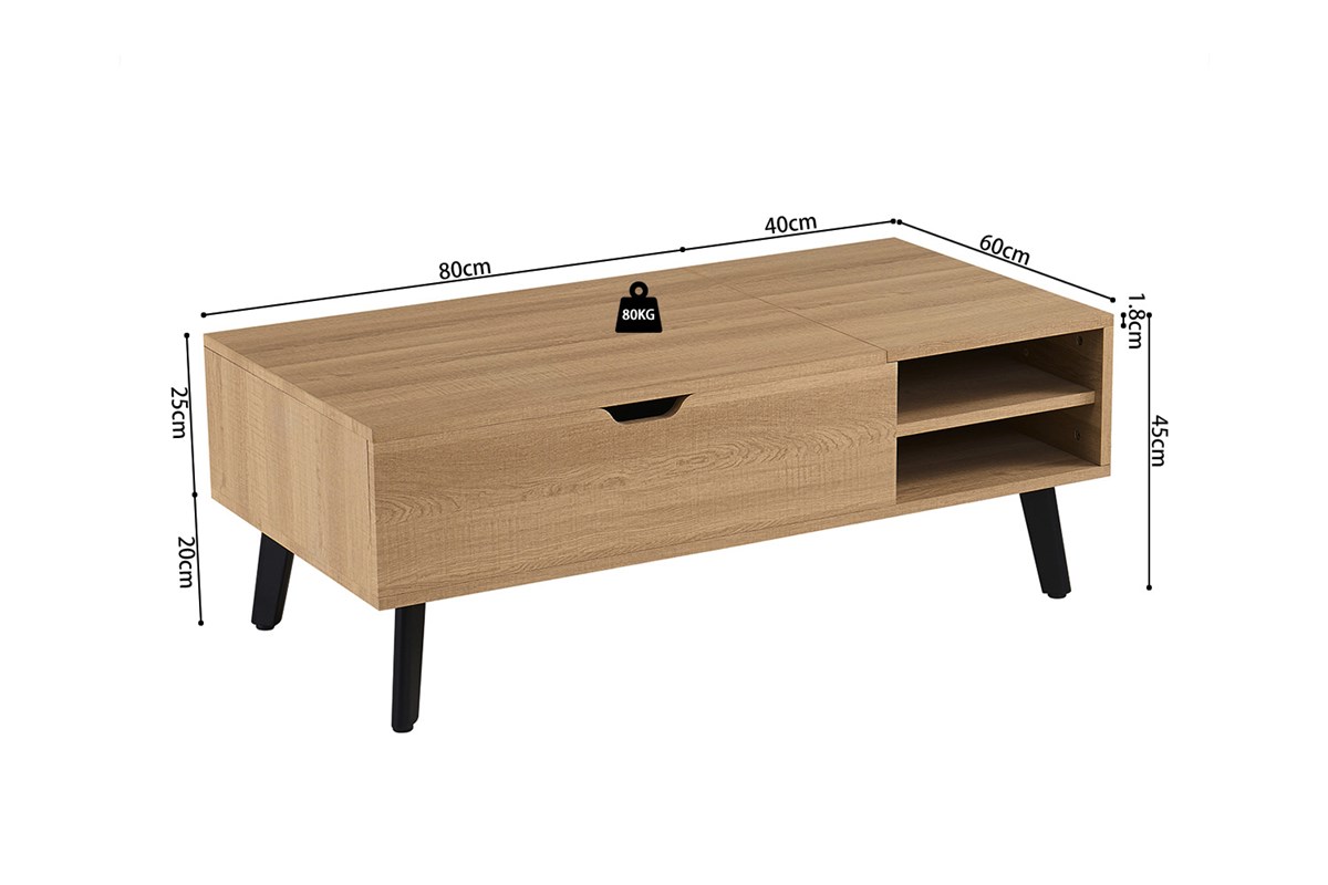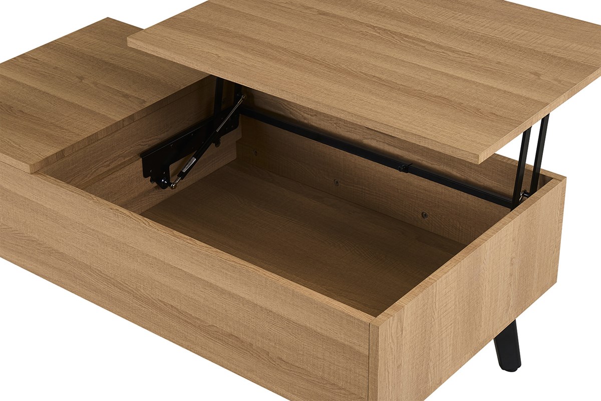 Het unieke aan deze salontafel is het opklapbare tafelblad, waarmee je eenvoudig extra opbergruimte creëert. Ideaal voor het opbergen van afstandsbedieningen, tijdschriften, laptops of andere dagelijkse benodigdheden. Dankzij het slimme ontwerp blijft jouw woonkamer netjes en georganiseerd.