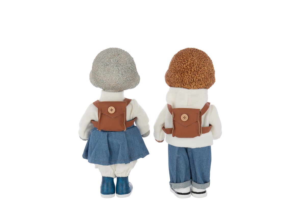Voeg een vleugje originaliteit en tederheid toe aan uw interieur met de set van 2 CANICHE beeldjes. Dit schattige duo bestaat uit twee gepersonifieerde poedels in een moderne stijl: een grijs teefje met een witte trui, een blauwe rok, een bruine schooltas en sneakers; en een bruin reutje met een witte trui met capuchon, een blauwe spijkerbroek, een bruine schooltas en bijpassende sneakers. Deze charmante en gedetailleerde beeldjes geven een speelse en warme toets aan een boekenplank, een console of een slaapkamer. Een decoratief detail dat jong en oud zal doen glimlachen!