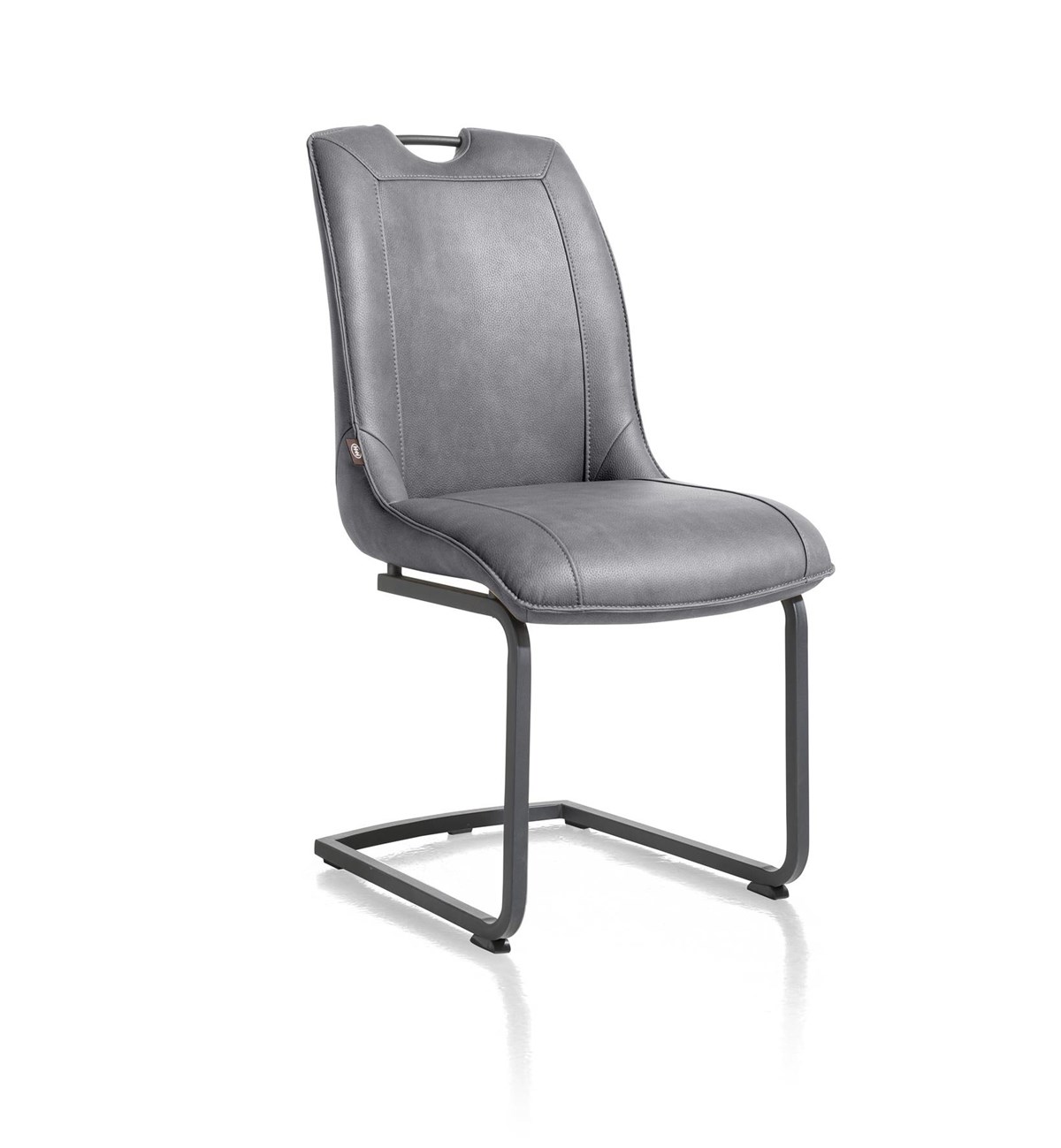 Het onderstel is een stevig, vierkant zwart metalen swingframe, dat zorgt voor stabiliteit en een moderne look. Een slimme, geïntegreerde handgreep in de rugleuning maakt het verplaatsen van de stoel extra gemakkelijk, zonder dat u de rugleuning hoeft vast te pakken.