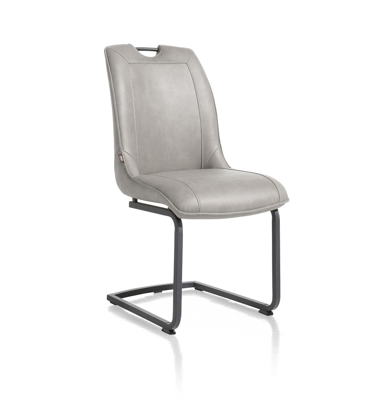 Het onderstel is een stevig, vierkant zwart metalen swingframe, dat zorgt voor stabiliteit en een moderne look. Een slimme, geïntegreerde handgreep in de rugleuning maakt het verplaatsen van de stoel extra gemakkelijk, zonder dat u de rugleuning hoeft vast te pakken.