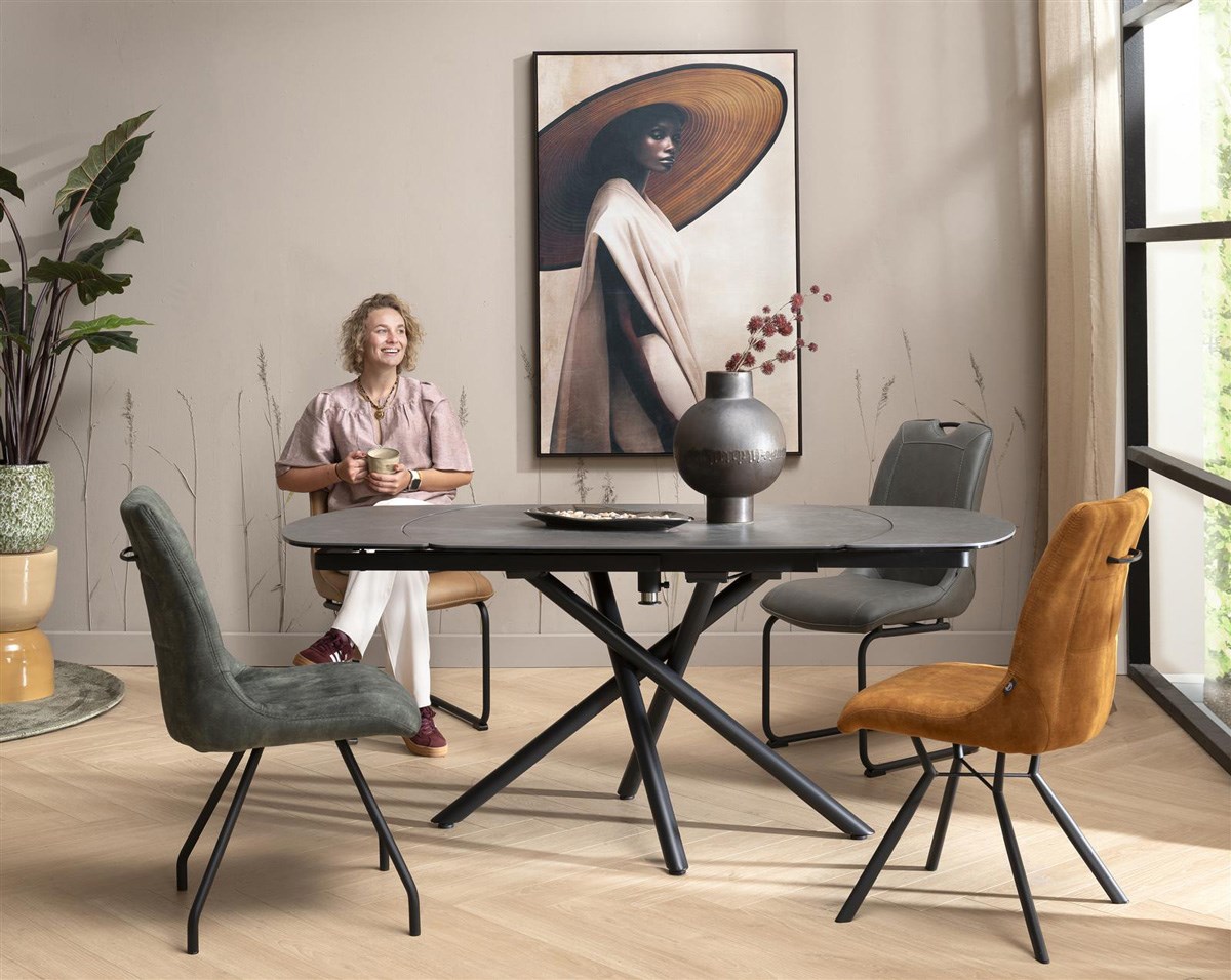 Deze uitvoering van de MISCHA is bekleed met de stof Karese in okergeel. Karese is een zachte, onderhoudsvriendelijke stof met de luxueuze uitstraling van velours. De warme koperkleur zorgt voor een stijlvolle en gezellige sfeer in de eetkamer.