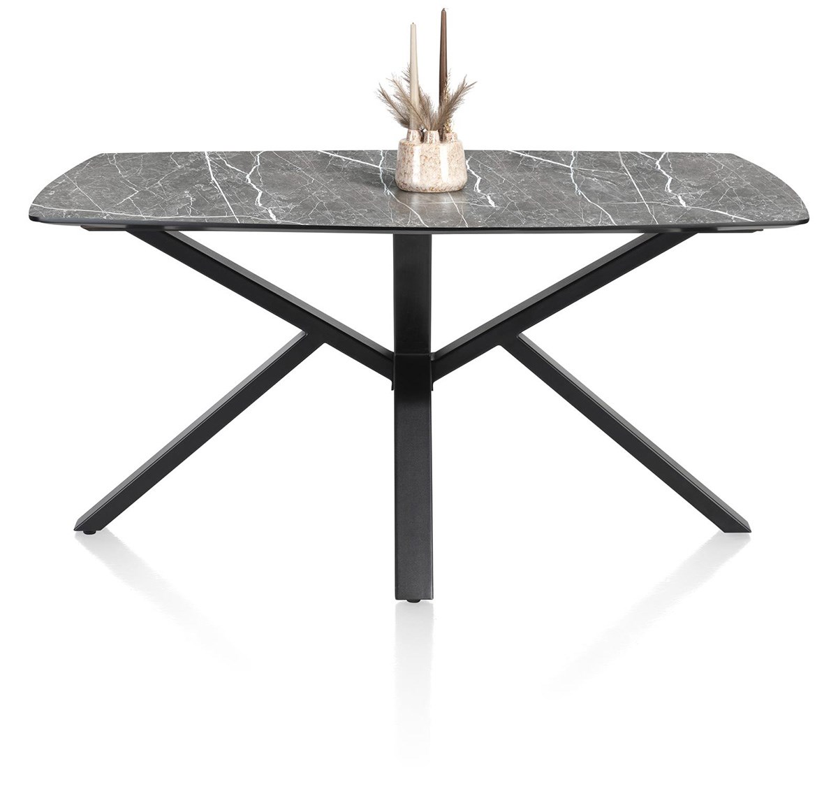 Het centrale onderstel van zwart metaal zorgt voor perfecte stabiliteit en houdt tegelijkertijd de ruimte rondom de tafel vrij.