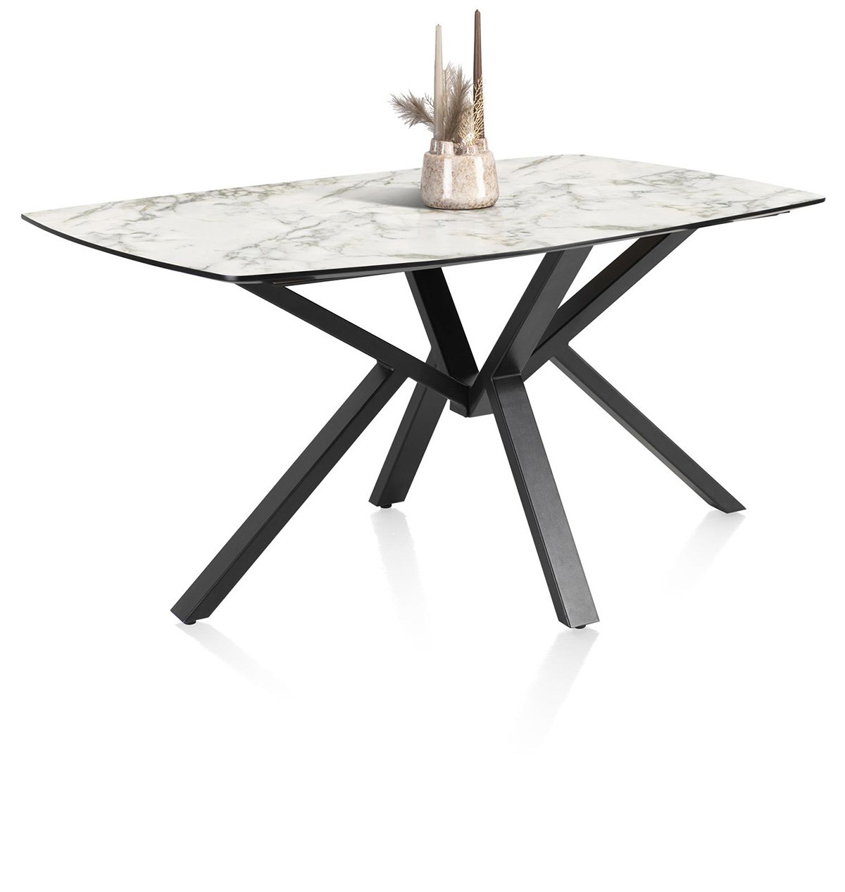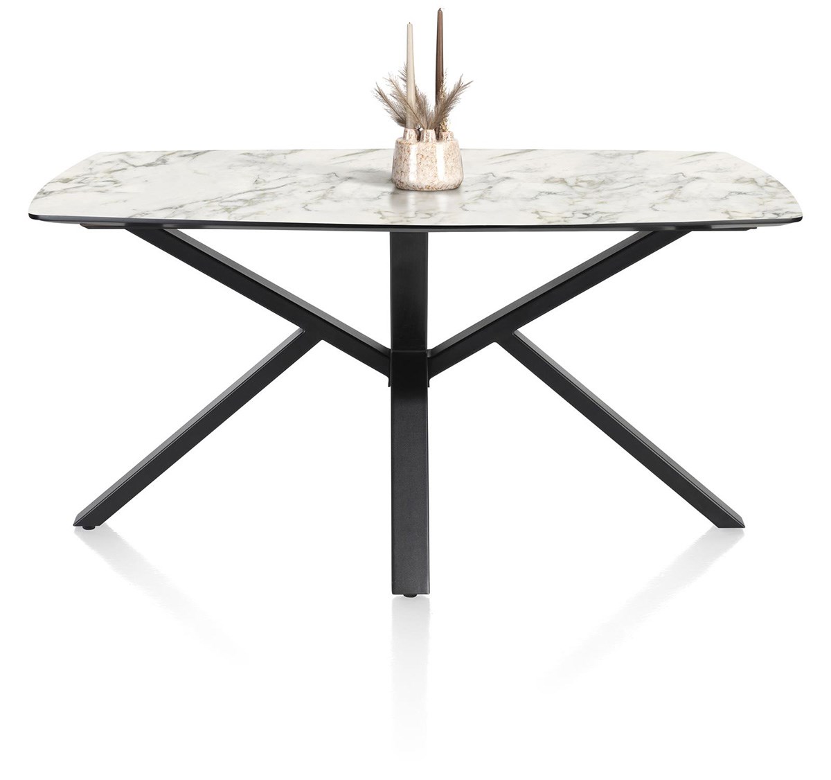 Het centrale onderstel van zwart metaal zorgt voor perfecte stabiliteit en houdt tegelijkertijd de ruimte rondom de tafel vrij.