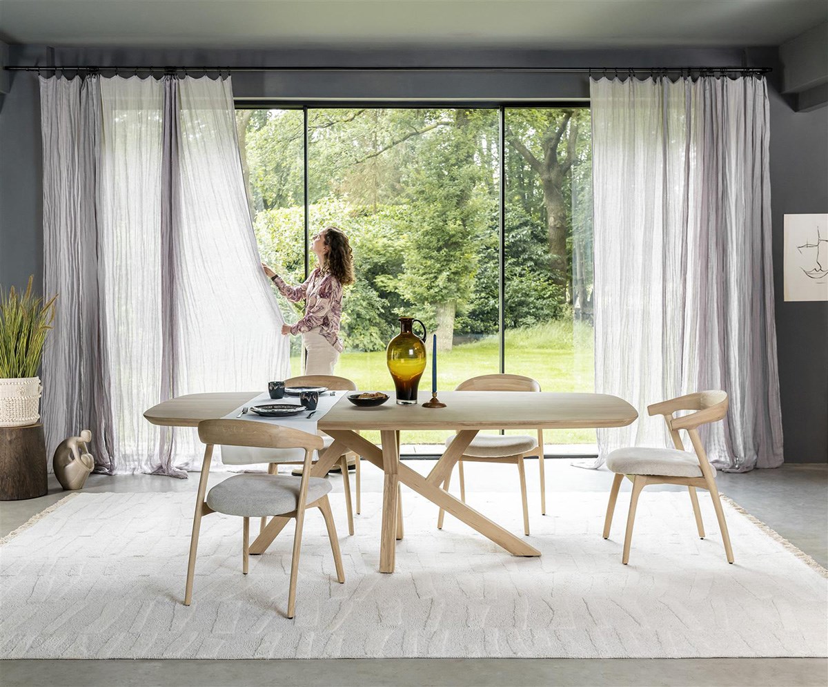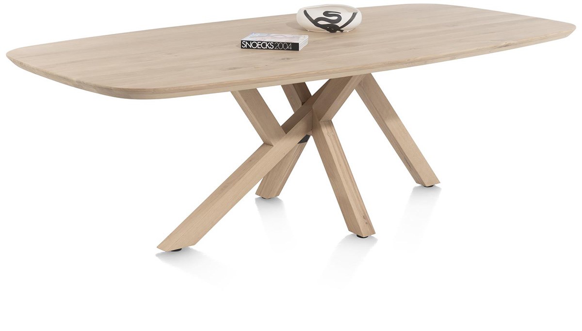 De SHIMLA tafel overtuigt met haar strakke Scandinavische design, ovalen blad van massief Duits eiken en uniek gekruist onderstel. Met afgeronde hoeken en een gepatineerde lakafwerking biedt ze een mooie matte uitstraling, goede lichtbestendigheid en versterkte bescherming. Dit grote formaat van 240x120 cm is ideaal voor ruime woonkamers. De SHIMLA-collectie is verkrijgbaar in vier maten, passend bij elk interieur.