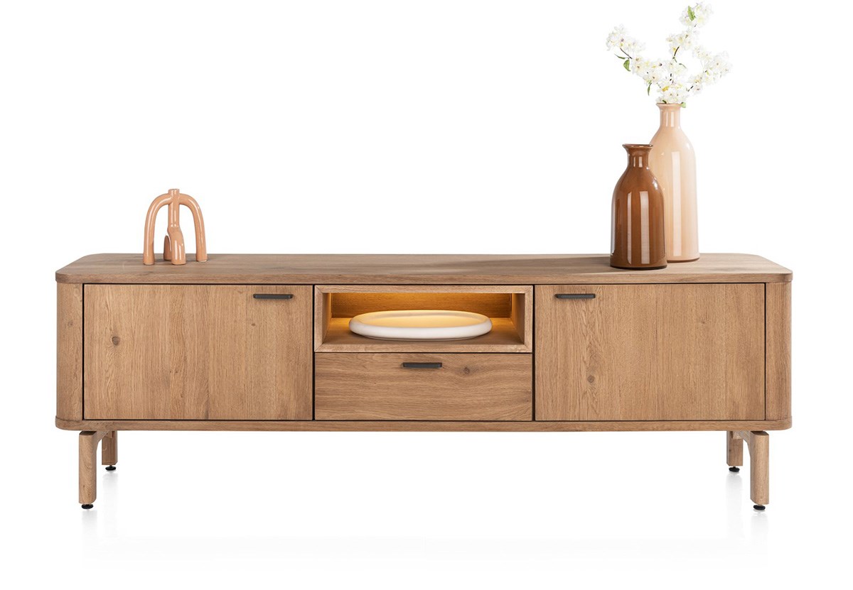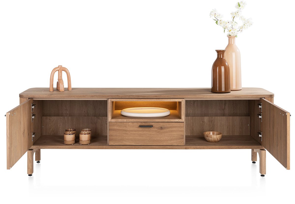 Dit TV meubel is praktisch ingedeeld met 2 deuren, 1 lade en 1 open niche, en biedt ruime opbergruimte voor multimedia-apparatuur, accessoires en dagelijkse spullen. Met zijn breedte van 170 cm is het ideaal voor grote televisies en geeft het uw woonkamer een uitstraling van elegantie en kwaliteit.
