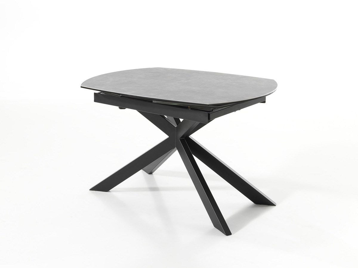 De verlengbare tafel JEREMY combineert innovatie, elegantie en functionaliteit en past zich aan alle gelegenheden aan. Het slimme draaibare blad maakt het eenvoudig om de tafel van 130 cm tot 190 cm te verlengen, ideaal voor dagelijks gebruik en gezellige diners met gasten. Het bladafwerking in grijze keramiek valt op door zijn eigentijdse uitstraling, hoge kras- en hittebestendigheid en eenvoudig onderhoud. Het centrale X-vormige metalen onderstel geeft een moderne grafische toets en garandeert uitstekende stabiliteit en optimaal zitcomfort. Praktisch en stijlvol, de JEREMY-tafel past perfect in een moderne en elegante eetkamer.