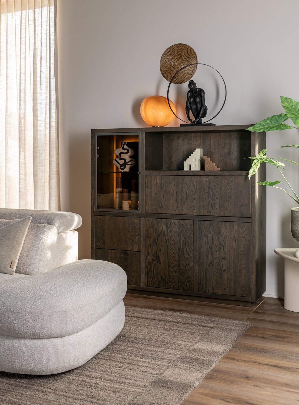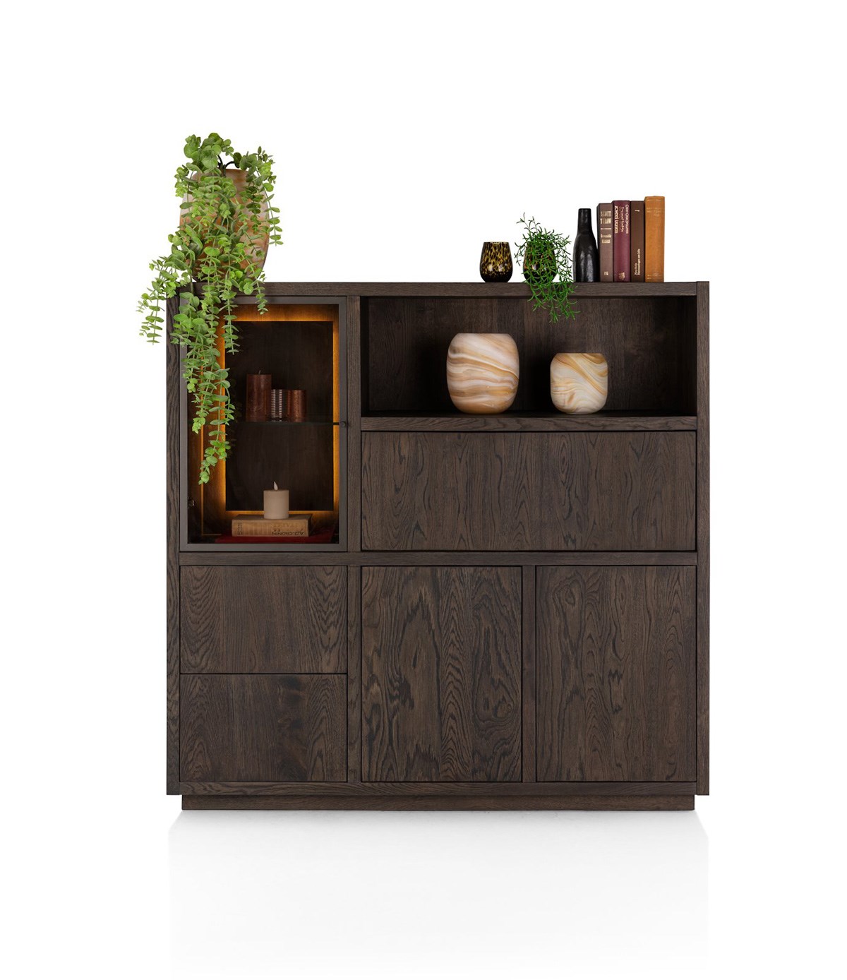 De GIJON‑vitrine is ontworpen om optimaal gebruik te maken van zowel gesloten als open opbergruimte. De kast beschikt over: