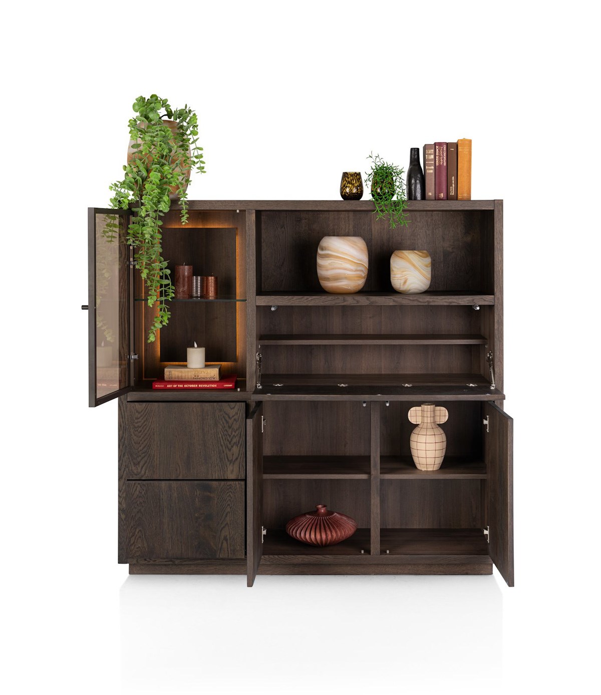 Deze veelzijdige indeling maakt de vitrine geschikt voor de woonkamer, eetkamer of zelfs kantoorruimte.